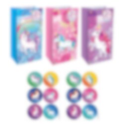 12 kpl juhlapusseja kolmella erilaisella kauniilla yksisarvisdesignilla, joista saat 4 kutakin. Nämä lumoavat juhlapussit ovat täydellisiä täytettäväksi makeisilla, pienillä leluilla tai muilla yllätyksillä vieraille.