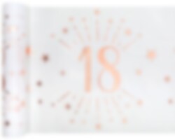 Tyylikäs kaitaliina jossa on kimaltava, ruusukullanvärinen kuviointi ja numero 18. Tämä kaitaliina tulee käytännöllisessä rullassa ja se on 30 cm leveä ja 5 metriä pitkä. Tästä liinasta riittää siis useampaan juhlaan! Materiaali on 30 % polyesteriä.