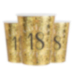 10 kpl kimaltavia kullanvärisiä pahvimukeja jossa on numero 18. Nämä mukit sopivat täydellisesti 18-vuotisjuhliin.
