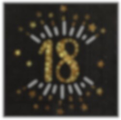 10 kpl mustia servettejä, joissa on koristeellisia kuvioita ja numero 18 kultaisella glitterillä . Nämä servetit ovat täydellisiä pöydän kattamiseen 18-vuotisjuhliin. Servetit ovat kolmikerroksisia ja tuntuvat ylellisiltä. Avattuna niiden mitat ovat 16,5 x 16,5 cm.