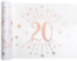 Tyylikäs kaitaliina jossa on kimaltava, ruusukullanvärinen kuviointi ja numero 20. Tämä kaitaliina tulee käytännöllisessä rullassa ja se on 30 cm leveä ja 5 metriä pitkä. Tästä liinasta riittää siis useampaan juhlaan! Materiaali on 30 % polyesteriä.