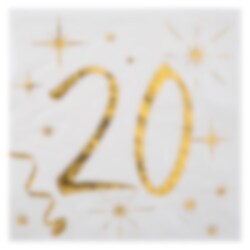 20 kpl valkoisia servettejä, joissa on koristekuvioita ja numero 20 kultafoliosta. Nämä servetit ovat täydellisiä pöydän kattamiseen 20-vuotisjuhliin. Servetit ovat kolmikerroksisia ja tuntuvat ylellisiltä. Avattuna niiden mitat ovat 12,5 x 12,5 cm.