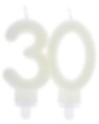 Kakkukynttilä, joka loistaa pimeässä, elegantisti numeron 30 muodossa. Kakkukynttilä on 7,5 x 9 cm kokoinen.