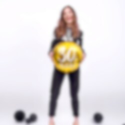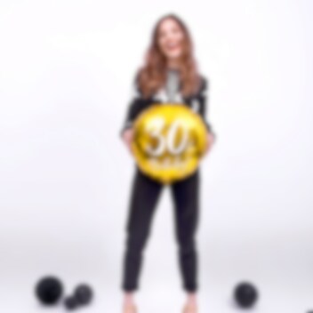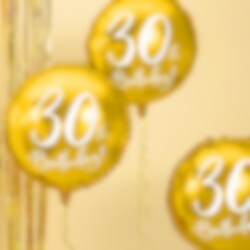 Tyylikäs metallinhohtoinen kullanvärinen foliopallo valkoisella painatuksella, jossa lukee "30th Birthday". Hauska koriste 30-vuotisjuhliin täytettäväksi ilmalla tai heliumilla. Ilmapallon on noin 45 cm.