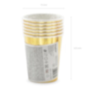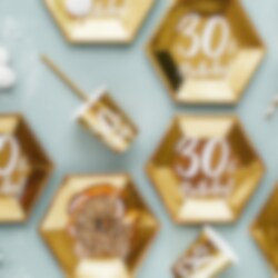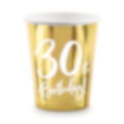 6 pahvimukia kauniilla kultaisella metallinhohtoisella värillä ja valkoisella tekstillä "30th Birthday!". Täydellinen 30-vuotisjuhlien kattauksessa. Mukien tilavuus on noin 2,2 dl.