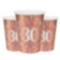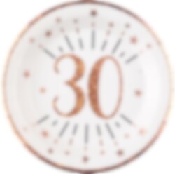 10 kpl tyylikkäitä, ruusukullanvärisiä kiiltäviä lautasia jossa on numero "30" lautasten keskellä. Nämä näyttävät ja juhlavat lautaset sopivat täydellisesti 30-vuotisjuhliin.