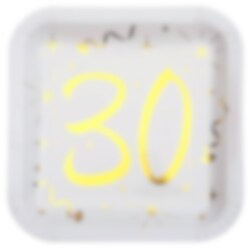 10 kpl valkoisia pahvilautasia kultafolioidulla koristekuvioilla ja numerolla 30. Nämä neliönmuotoiset lautaset ovat hieno lisä 30-vuotisjuhlien kattaukseen. Lautaset ovat 23 x 23 cm kokoisia.