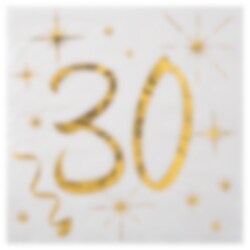 20 kpl valkoisia servettejä, joissa on koristekuvioita ja numero 30 kultafoliosta. Nämä servetit ovat täydellisiä pöydän kattamiseen 30-vuotisjuhliin. Servetit ovat kolmikerroksisia ja tuntuvat ylellisiltä. Avattuna niiden mitat ovat 12,5 x 12,5 cm.