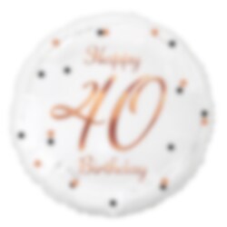 Upea valkoinen ilmapallo, jossa on mustalla ja ruusukullalla painettuja kuvioita ja keskellä numero 40. Kaunis koriste 40-vuotissyntymäpäiville. Lisää muita ilmapalloja kauniiksi kimpuksi.