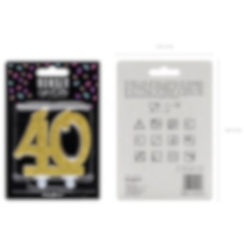 Hieno kynttilä, jossa on kultaista kimalletta. Hieno kynttilä syntymäpäiville. Kakkukynttilässä on numero 40 ja sopii se erinomaisesti 40-vuotisjuhliin. Kakkukynttilä on 7,5 cm kokoinen.