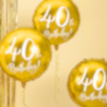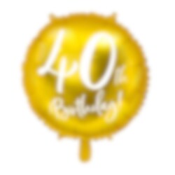 Tyylikäs metallinhohtoinen kullanvärinen foliopallo valkoisella painatuksella, jossa lukee "40th Birthday!". Hauska täyttää ilmalla tai heliumilla ja laittaa koristeeksi 40-vuotisjuhliin. Ilmapallon koko on noin 45 cm.