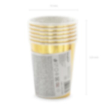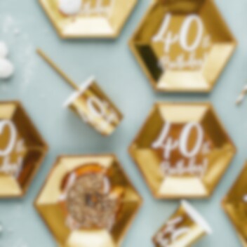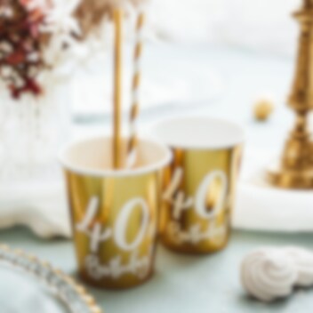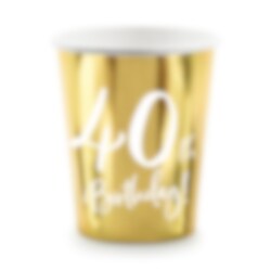 6 kultaista metallinhohtoista pahvimukia, joissa on valkoinen teksti "40th Birthday!". Hieno koriste 40-vuotisjuhliin! Mukien tilavuus on noin 2,2 dl.