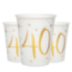 10 kpl valkoisia pahvimukkeja kultafolioiduilla koristetähdillä ja numerolla 40. Mukit ovat todella kauniita ja täydellinen lisä 40-vuotisjuhlien kattaukseen. Mukien korkeus on 10 cm ja tilavuus 270 ml.