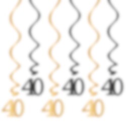 Lisää loistoa 40-vuotisjuhliin näillä mustakultaisilla riippuvilla koristeilla! Sarja sisältää kuusi kierrekoristetta kiiltävästä foliosta, joista kolme on kultaisia numerolla 40 ja kolme mustia numerolla 40.