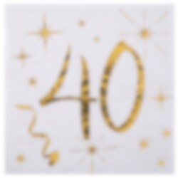 20 kpl valkoisia servettejä, joissa on koristekuvioita ja numero 40 kultafoliosta. Nämä servetit ovat täydellisiä pöydän kattamiseen 40-vuotisjuhliin.. Servetit ovat kolmikerroksisia ja tuntuvat ylellisiltä. Avattuna niiden mitat ovat 12,5 x 12,5 cm.