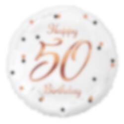 Upea valkoinen ilmapallo, jossa on mustalla ja ruusukullalla painettuja kuvioita ja keskellä numero 50. Kaunis koriste 50-vuotissyntymäpäiville. Lisää muita ilmapalloja kauniiksi kimpuksi.