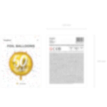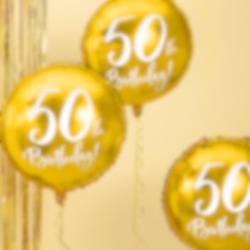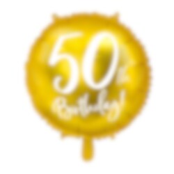 Tyylikäs kultainen metallinhohtoinen foliopallo valkoisella painatuksella, jossa lukee "50th Birthday!". Hauska koriste täytettäväksi ilmalla tai heliumilla 50-vuotisjuhlia varten. Ilmapallon koko on noin 45 cm.