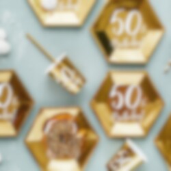 6 kultaista metallinhohtoista pahvimukia, joissa on valkoinen teksti "50th Birthday!!". Kattaa pöytä ja tarjoile hyviä juomia näistä mukeista 50-vuotisjuhlien aikana. Mukien tilavuus on noin 2,2 dl.