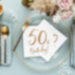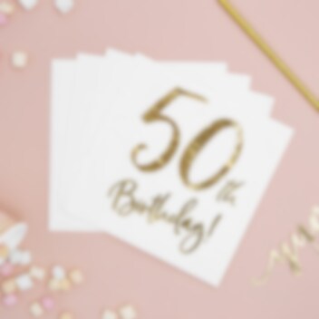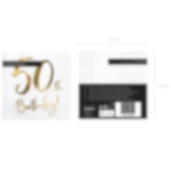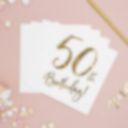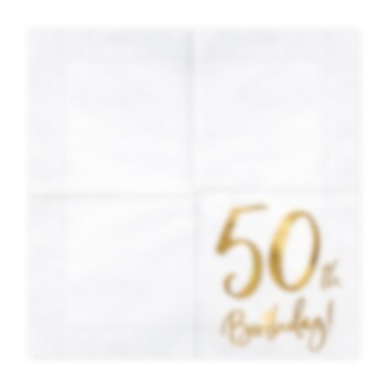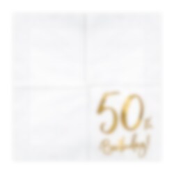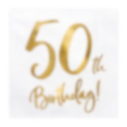 20 valkoista servettiä, joissa on kullanvärinen foliopainatus, jossa lukee "50th Birthday!" Hienot servetit 50-vuotisjuhliin. Servetit ovat vakiokokoisia, noin 33 x 33 cm auki taiteltuna.