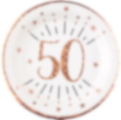 10 kpl tyylikkäitä, ruusukullanvärisiä kiiltäviä lautasia jossa on numero "50" lautasten keskellä. Nämä näyttävät ja juhlavat lautaset sopivat täydellisesti 50-vuotisjuhliin.
