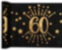 Musta kaitaliina koristeellisilla kuvioilla ja kultafolioidulla numerolla 60. Tämä kaitaliina toimitetaan kätevästi rullana. Se on 30 cm leveä ja 5 metriä pitkä. Se riittää usempiin pöytiin ja isompaan juhlaan. Materiaali on 100 % polyesteria.