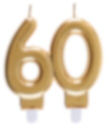 Kullanvärinen ja elegantti kakkukynttilä, joka on numeron 60 muotoinen. Kakkukynttilä on 7,5 x 9 cm kokoinen.