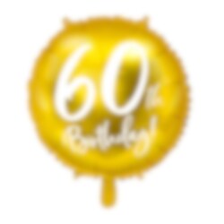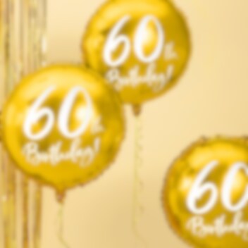 Tyylikäs metallinhohtoinen kultainen foliopallo valkoisella painatuksella, jossa lukee "60th Birthday!". Hauska koriste ilmalla tai heliumilla täytettäväksi ennen 60-vuotisjuhlaa. Ilmapallon koko on noin 45 cm.