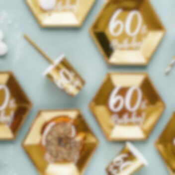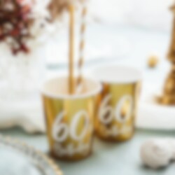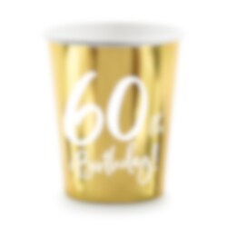 6 kaunista kullanväristä pahvimukia, joissa on valkoinen teksti "60th Birthday!". Täydellinen 60-vuotisjuhlien kattaukseen. Mukien tilavuus on noin 2,2 dl.