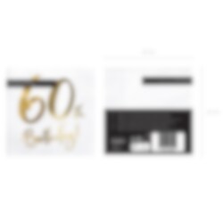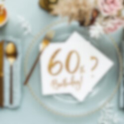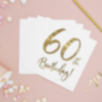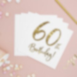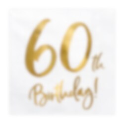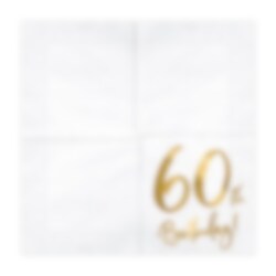 20 valkoista servettiä kultaisella painatuksella, jossa lukee "60th Birthday!". Täydellinen 60-vuotisjuhlien kattaukseen. Servetit ovat vakiokokoisia, noin 33 x 33 cm auki taiteltuna.