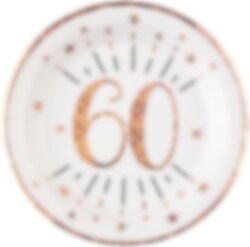 10 kpl tyylikkäitä, ruusukullanvärisiä kiiltäviä lautasia jossa on numero "60" lautasten keskellä. Nämä näyttävät ja juhlavat lautaset sopivat täydellisesti 60-vuotisjuhliin.