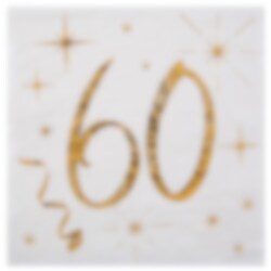 20 kpl valkoisia servettejä, joissa on koristekuvioita ja numero 60 kultafoliosta. Nämä servetit ovat täydellisiä pöydän kattamiseen 60-vuotisjuhliin. Servetit ovat kolmikerroksisia ja tuntuvat ylellisiltä. Avattuna niiden mitat ovat 12,5 x 12,5 cm.