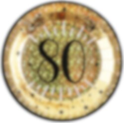 10 kpl kimaltavia kullanvärisiä lautasia jossa on numero 80. Kauniit lautaset sopivat täydellisesti 80-vuotisjuhlien koristeluun. Lautaset ovat pahvia ja niiden halkaisija 22,5 cm. Yhdistä muiden saman sarjan juhlatarvikkeiden kanssa ja saat täydelliset 80-vuotisjuhlat.