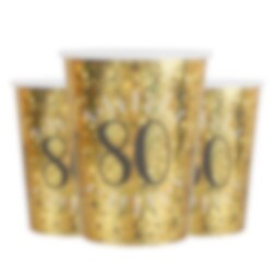 10 kpl kimaltavia kullanvärisiä pahvimukeja jossa on numero 80. Nämä mukit sopivat täydellisesti 80-vuotisjuhliin.