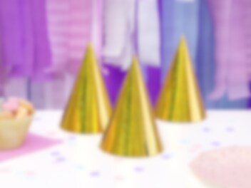 6 kpl kimaltavia kultaisia synttärihattuja, jotka sopivat joka juhliin tai synttäreille. Hatut on valmistettu paperista ja ne ovat 17 cm korkeita. Pysyy paikoillaan kuminauhan avulla.