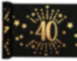 Musta kaitaliina koristeellisilla kuvioilla ja kultafolioidulla numerolla 40. Tämä kaitaliina toimitetaan kätevästi rullana. Se on 30 cm leveä ja 5 metriä pitkä. Se riittää usempiin pöytiin ja isompaan juhlaan. Materiaali on 100 % polyesteria.