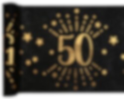 Musta kaitaliina koristeellisilla kuvioilla ja kultafolioidulla numerolla 50. Tämä kaitaliina toimitetaan kätevästi rullana. Se on 30 cm leveä ja 5 metriä pitkä. Se riittää usempiin pöytiin ja isompaan juhlaan. Materiaali on 100 % polyesteria.