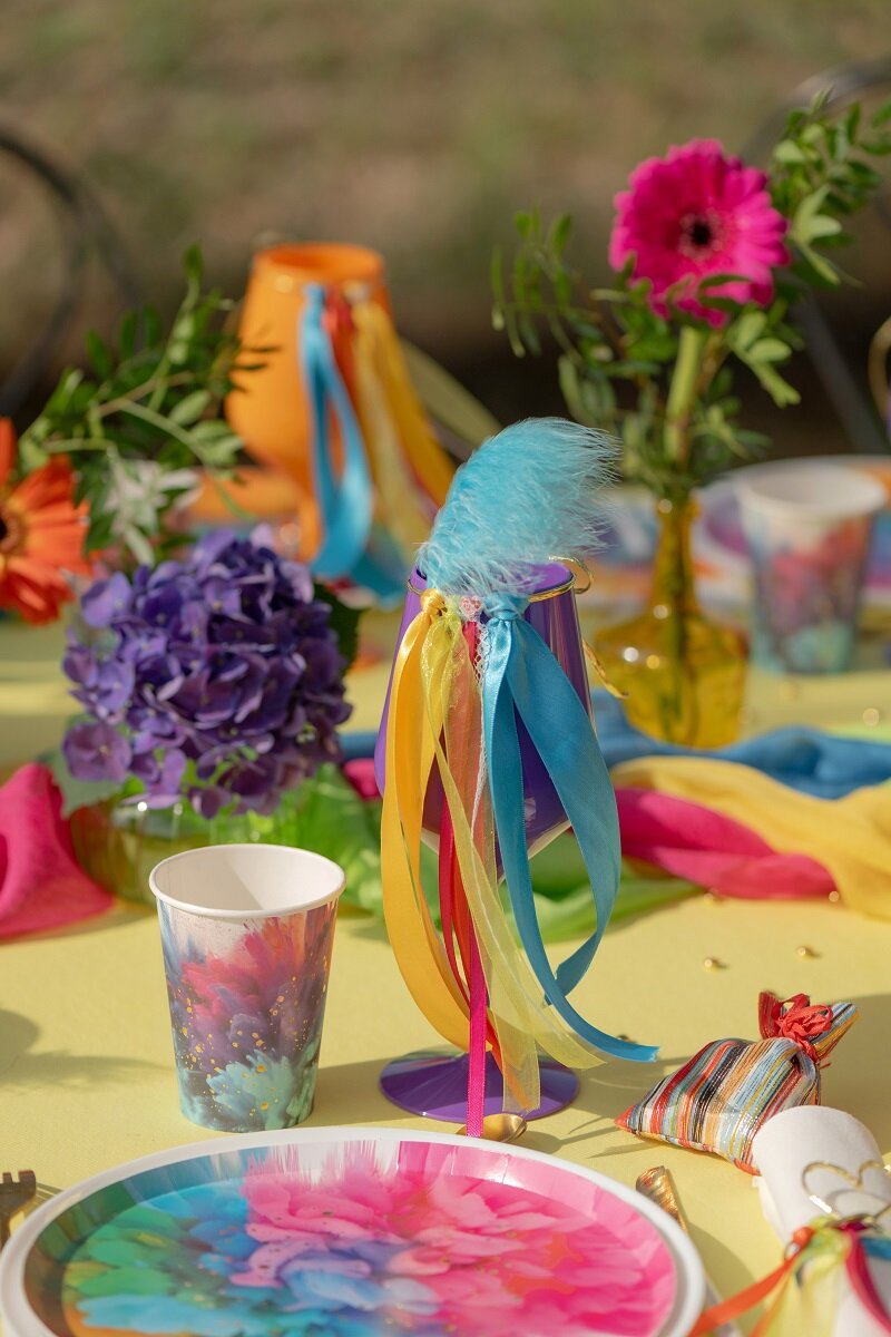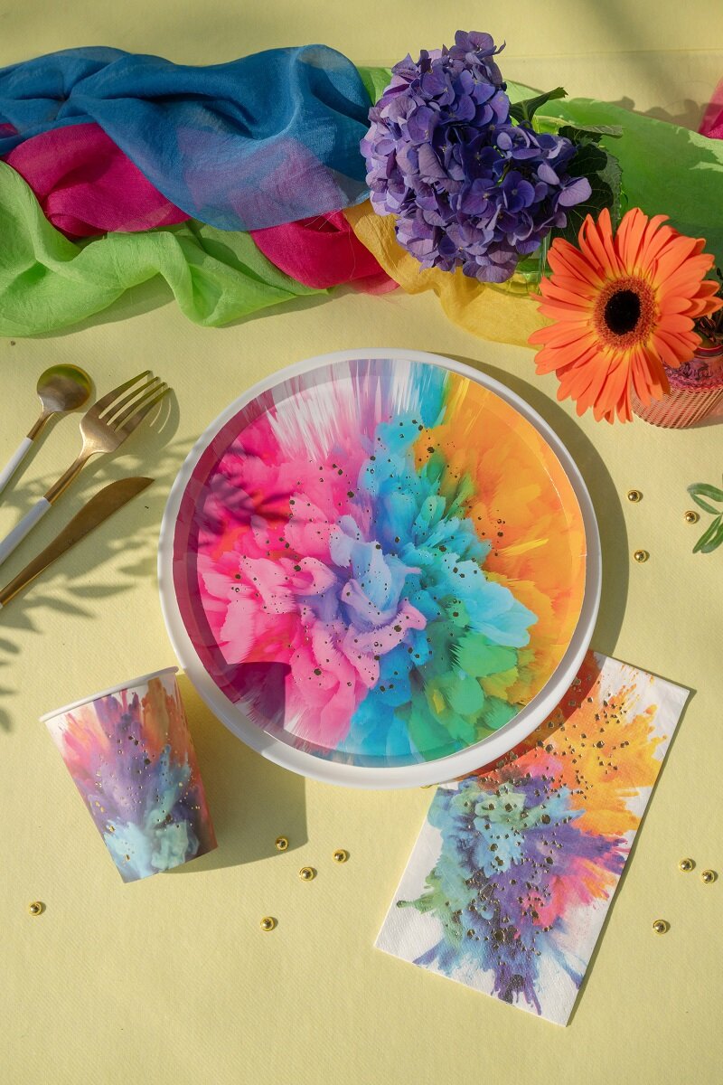Värikkäät servetit, jotka sopivat täydellisesti synttärijuhliin, juhliin ja muihin tilaisuuksiin, joissa kattauksen halutaan erottuvan joukosta. Värikylläinen kuvio kirkkaissa sävyissä yhdessä kiiltävien kultadetaljien kanssa luo eloisan ja koristeellisen ilmeen.