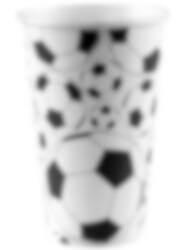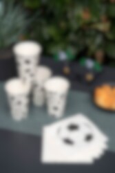 Isoja jalkapalloteeman pahvimukeja, joiden tilavuus on 500 ml.