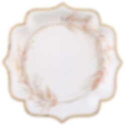 10 kpl korkealaatuisia pahvilautasia kauniilla muotoilulla ja neutraalilla lehtikuvioilla. Kultafoliotuja yksityiskohtia ja kultaiset reunat. Lautaset sopivat synttäreille, ristiäisiin, juhliin ja häihin. Ne kannattaa yhdistää saman malliston kattaustuotteisiin ja muihin neutraaleihin tai kultaisiin koristeisiin.