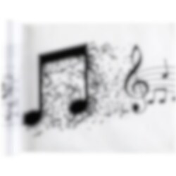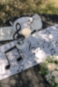 Valkoinen pöytäliina, jossa on koristeellisia mustia nuotteja. Pöytäliina on täydellinen teemajuhliin, joissa musiikki on jollain tavalla keskipisteenä.