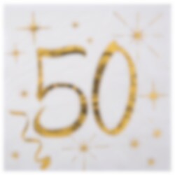 20 kpl valkoisia servettejä, joissa on koristekuvioita ja numero 50 kultafoliosta. Nämä servetit ovat täydellisiä pöydän kattamiseen 50-vuotisjuhliin. Servetit ovat kolmikerroksisia ja tuntuvat ylellisiltä. Avattuna niiden mitat ovat 12,5 x 12,5 cm.