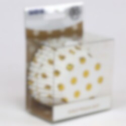 30 kpl valkoisia muffinssimuotteja, joissa on kultaisia foliopilkkuja. Käytä näitä, kun leivot makeita leivonnaisia juhliin. Muottien pohja on n. 5 cm.
