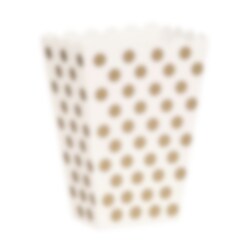 8 valkoista snäcks-laatikkoa joissa kullanvärisiä täpliä. Laatikot voi täyttää esimerkiksi pähkinöillä, popcornilla tai karkeilla ja sopivat mainiosti kaikkiin juhliin. Snäcks-laatikot ovat tehty pahvista ja ne ovat noin 11 x 14 cm kokoisia.