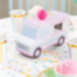 Pöytäkoriste, joka esittää jäätelöautoa pastelliväreissä. Laita piste i:n päälle asettamalla tämä hieno koriste esille juhlapöytään Ice Cream Party-teemaisille synttäreille. Jäätelöauton koko koottuna on noin 23 x 16 x 9 cm.