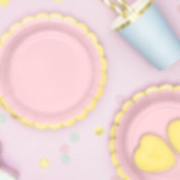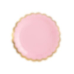 6 kpl pastellipinkkejä pahvilautasia kultafolioiduilla reunoilla. Ihanat pöytäkattaukseen asetettaviksi ennen synttäreitä tai babyshower-juhlia. Lautasten halkaisija on noin 18 cm.