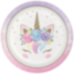 8 kpl pahvilautasia pastelliroosan/liilan värisillä reunoilla ja valkoisella taustalla sekä värikäällä yklsisarvisen ja tähtien kuva-aiheella. Lautasten halkaisija on noin 22 cm.