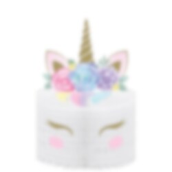 Hunajakennopöytäkoriste, joka muistuttaa kakkua yksisarvisteemalla, värinä enimmäkseen valkoinen. yksityiskohdat pastelliväreillä. Vaikuttava koriste babyshower-juhliin yksisarvisteemalla. Koristeen koko on 19 x 30 cm.