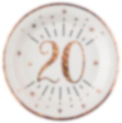 10 kpl tyylikkäitä, ruusukullanvärisiä kiiltäviä lautasia jossa on numero "20" lautasten keskellä. Nämä näyttävät ja juhlavat lautaset sopivat täydellisesti 20-vuotisjuhliin.