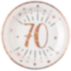 10 kpl tyylikkäitä, ruusukullanvärisiä kiiltäviä lautasia jossa on numero "70" lautasten keskellä. Nämä näyttävät ja juhlavat lautaset sopivat täydellisesti 70-vuotisjuhliin.