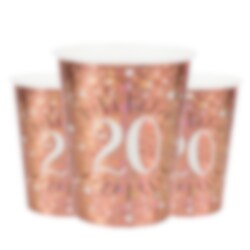 10 kpl tyylikkäitä, ruusukullanvärisiä kimaltavia pahvimukeja jossa on numero "20".